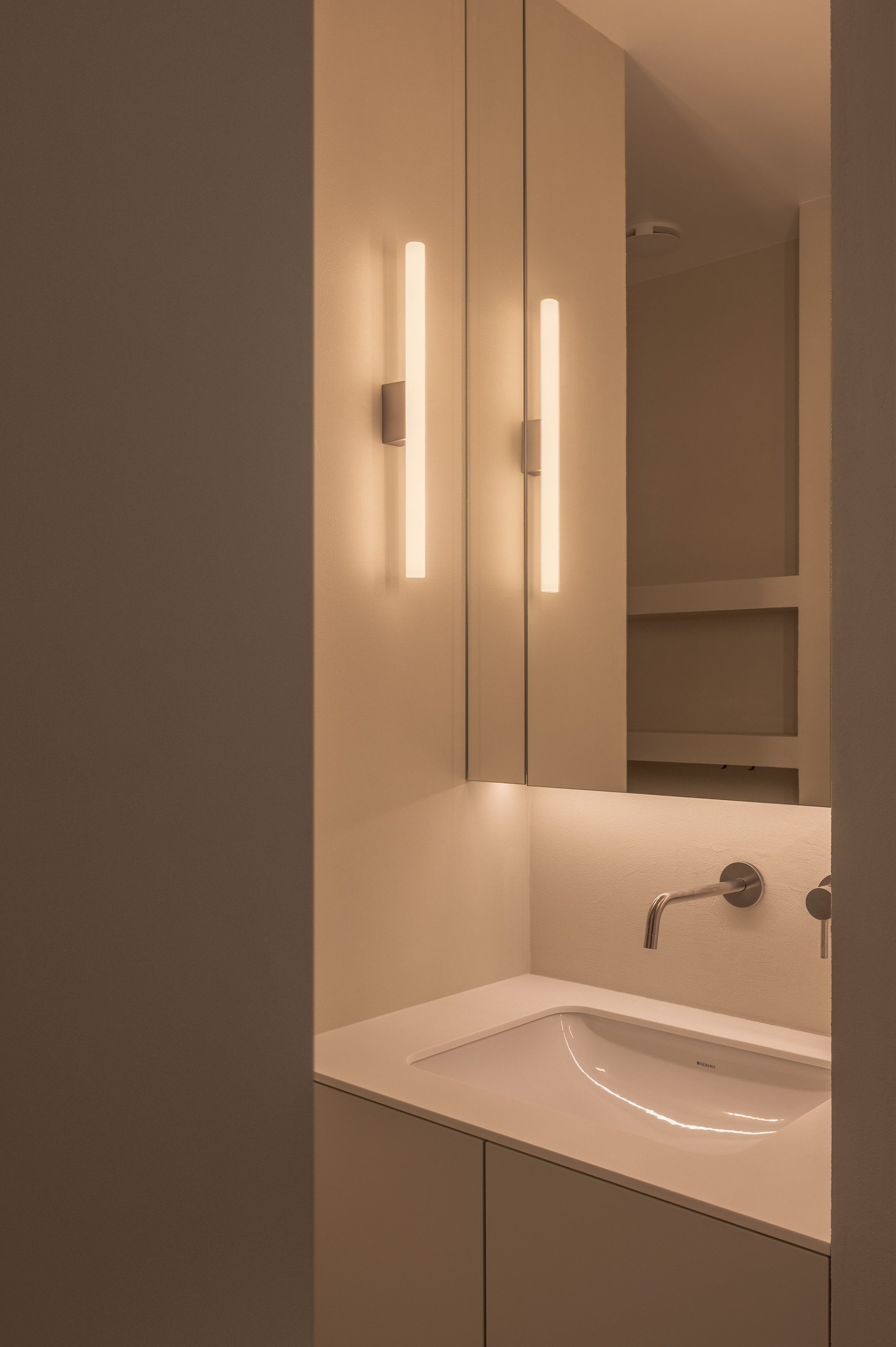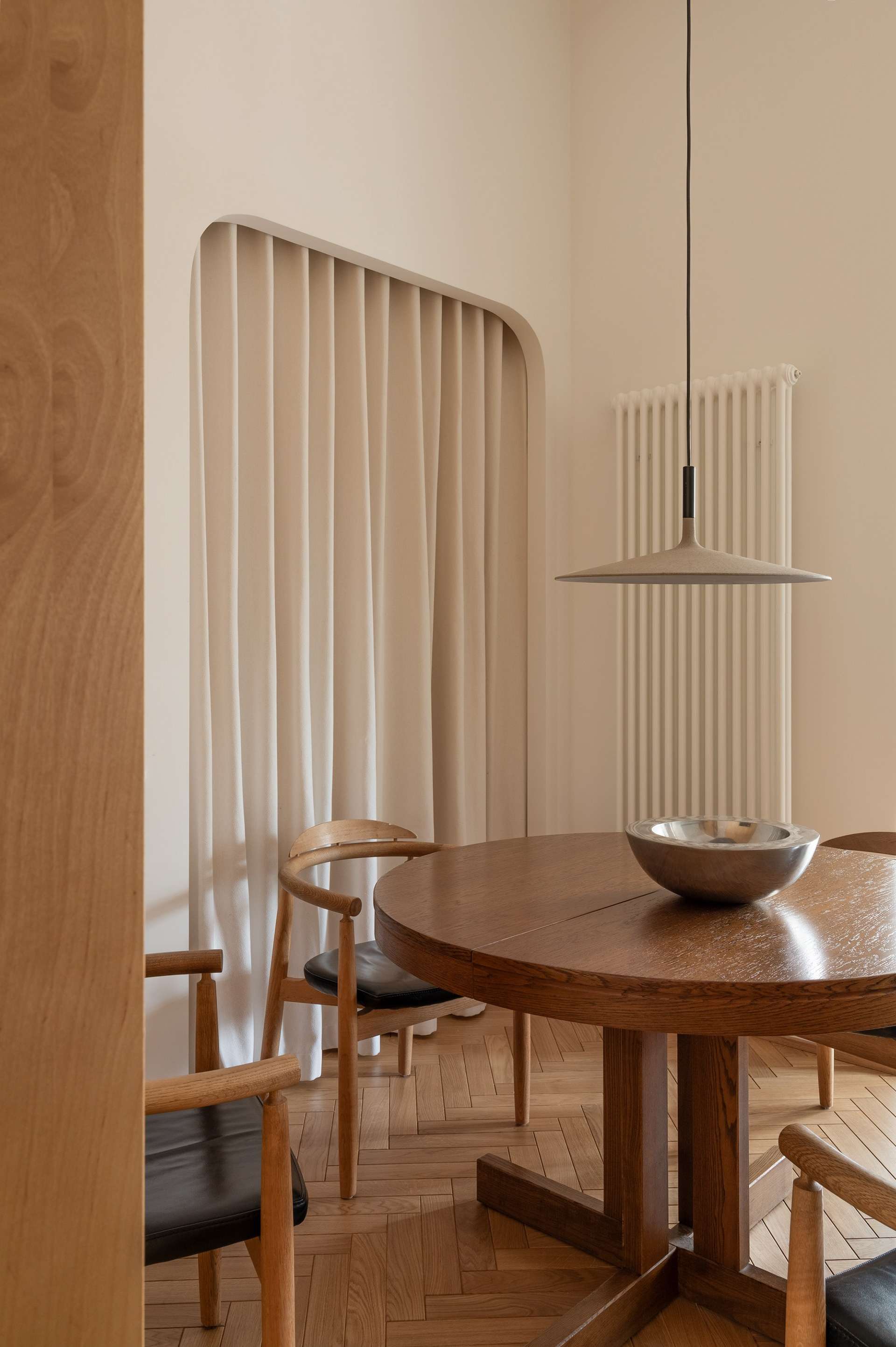 Зі створеного у квартирі тільки необхідне: фасади кухні, що покриті тонованим березовим шпоном та новий дубовий паркет, який зберіг автентичний характер приміщення. Для практичності й довговічності у санвузлах і на кухонному фартусі використали кварцове покриття, що гармонійно вписалося у загальну композицію житла.