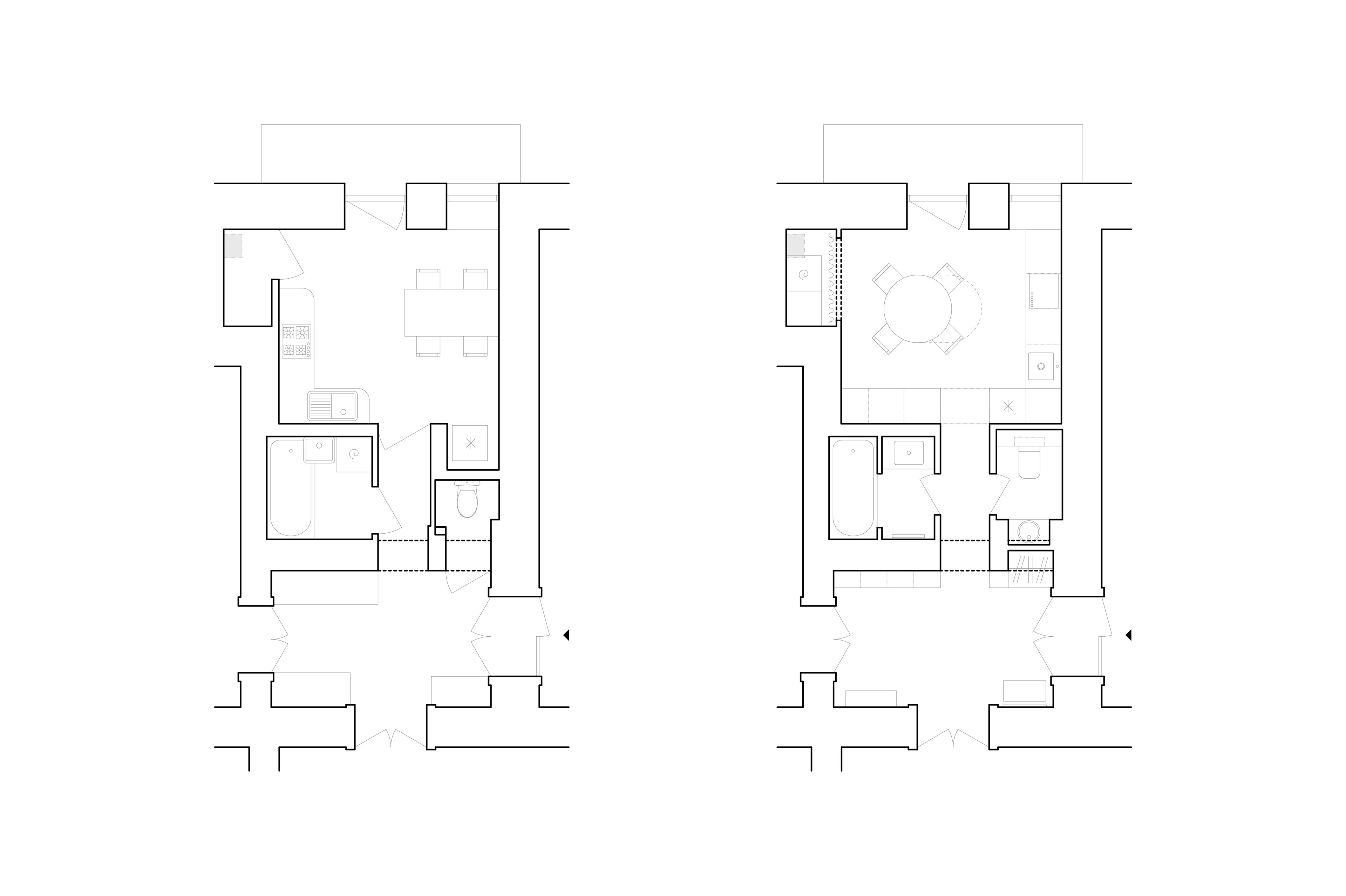 Ремонт планувався не у всій квартирі, а лише в коридорі, кухні та санвузлах через необхідність замінити сантехнічні труби. Щоб реалізувати запит, ми частково перепланували ці приміщення, а також змінили розміщення входу в туалет. Це дало змогу розташувати шафу для верхнього одягу і необхідних речей при вході.